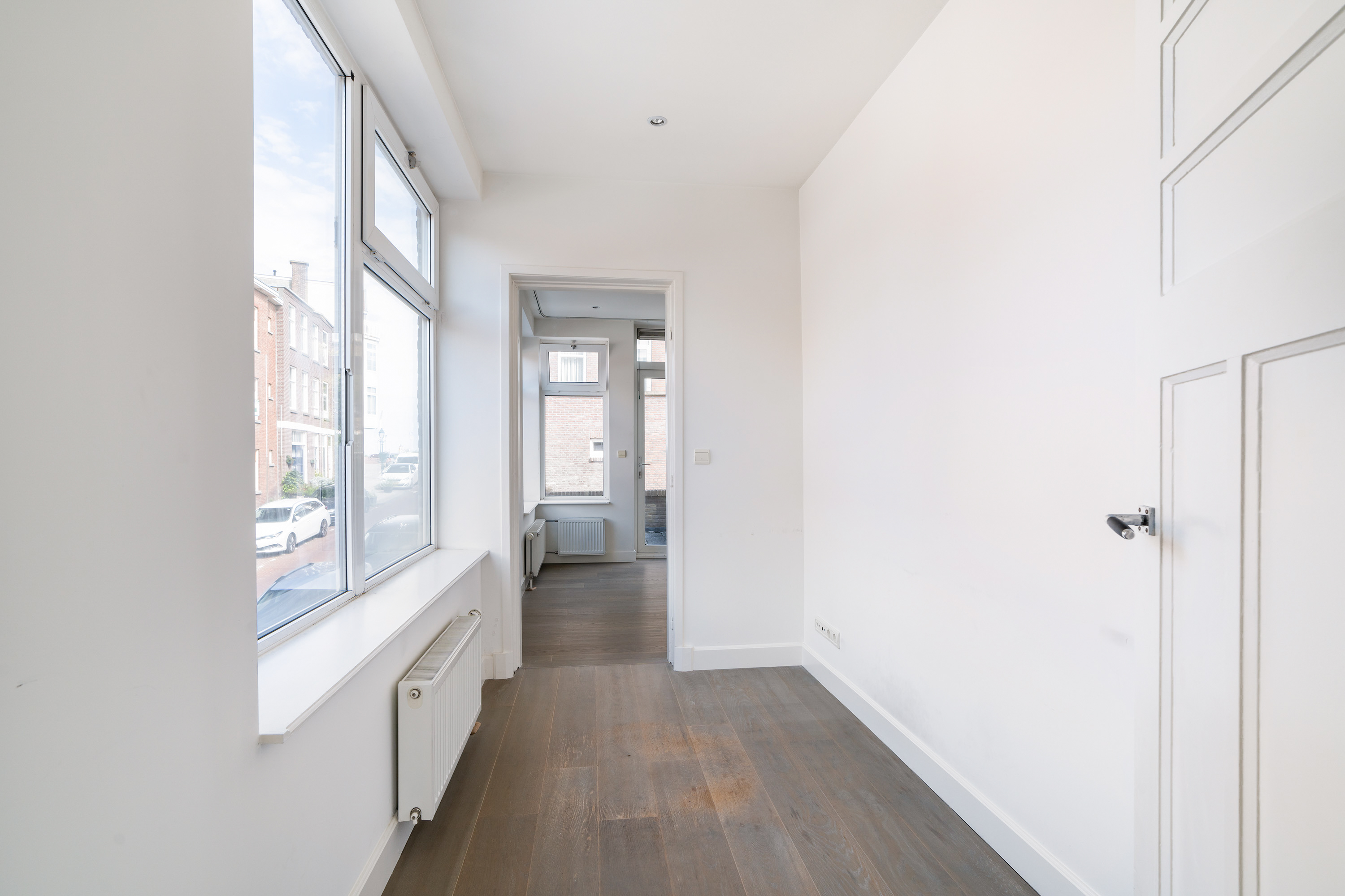 Entree van het appartement op straatniveau, met trap naar de 1e etage. Hal met toegang tot de woonkamer aan de rechterzijde, gelegen op de hoek van het pand, wat resulteert in een fraai uitzicht en fantastische lichtinval. De tussengelegen keuken is voorzien van oven, vaatwasser, 4-pits gasfornuis, afzuigkap, koelkast, vriezer en toegang tot het tweede balkon. De hoofdslaapkamer bevindt zich aan de achterzijde, met toegang tot het terras en de 2e slaapkamer is bereikbaar via de living. De moderne badkamer is voorzien van ruime inloopdouche met regendouche, wastafel met badkamermeubel en toilet.